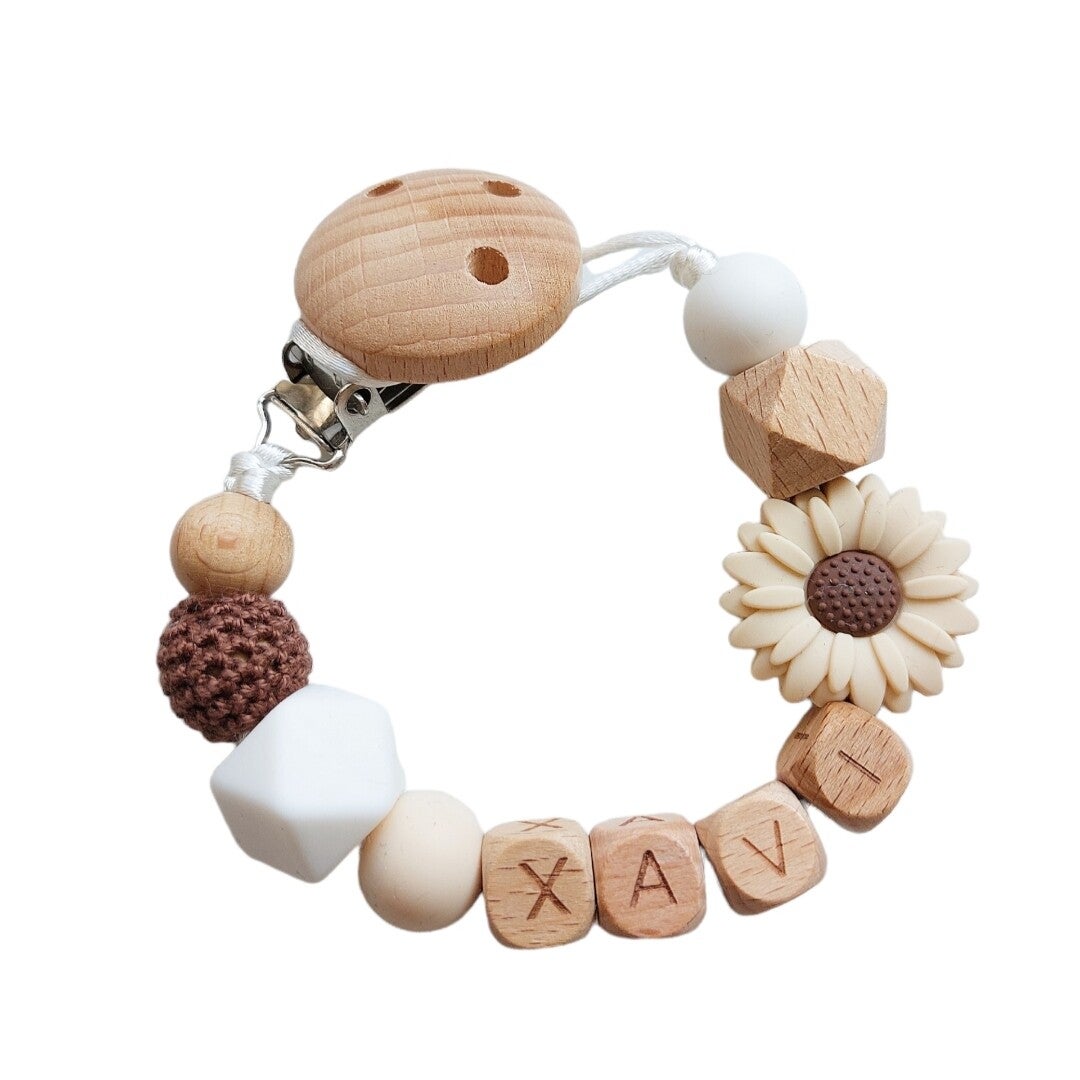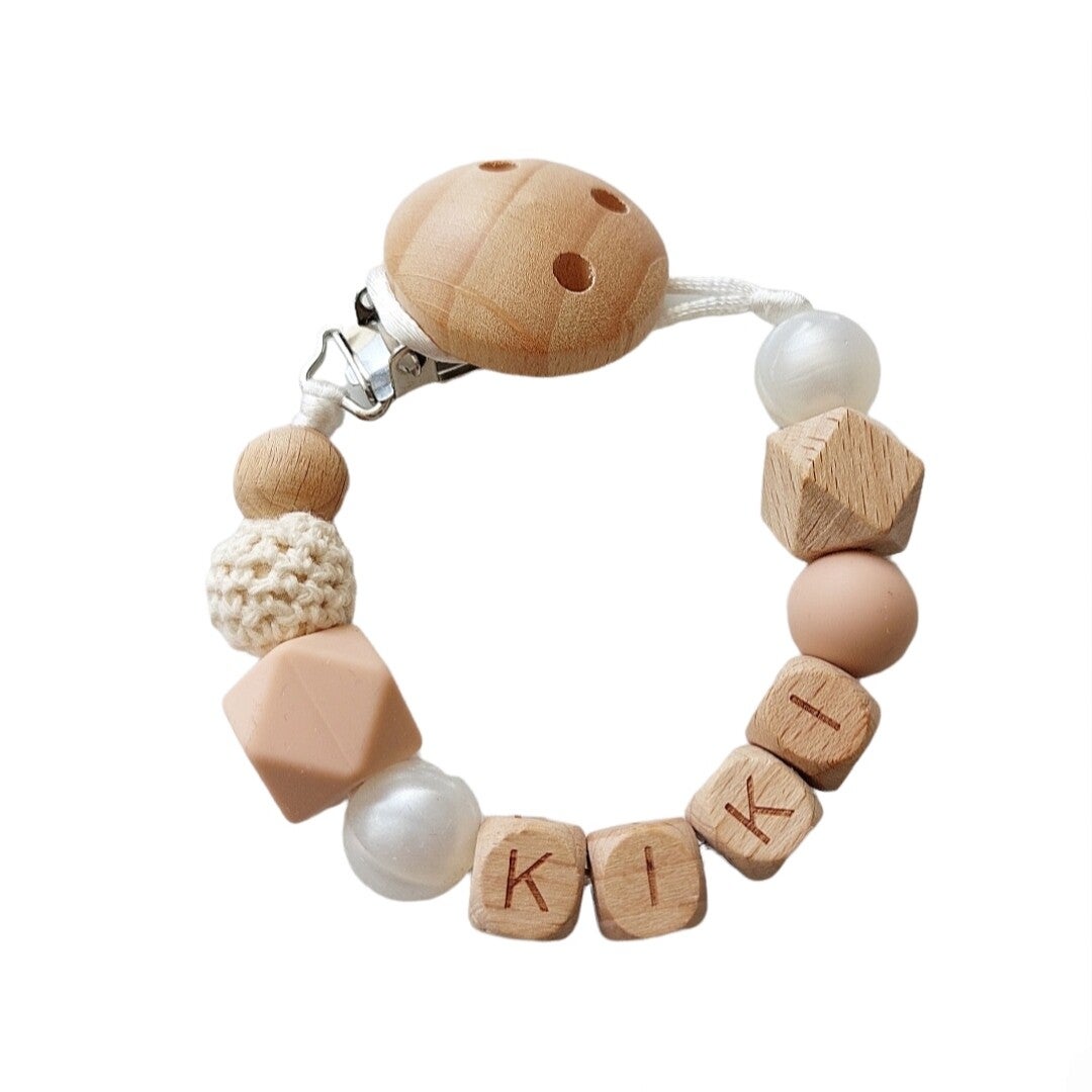 - Deze speenkoord met naam is handgemaakt van een mooie kwaliteit satijnkoord, siliconen kralen, houten letterkralen & een houten clip.